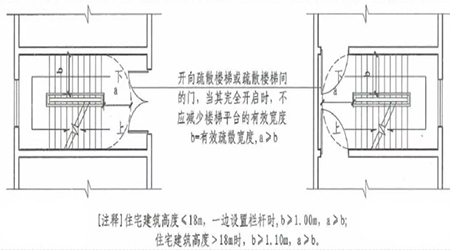 3、開向疏散樓梯或疏散樓梯間的門,當其完全開啟時,不應(yīng)減少樓梯平臺的有效寬度。(6.4.11)