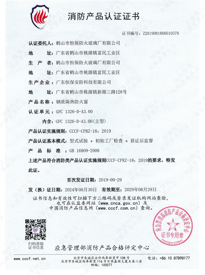 2.00H固定防火窗消防產(chǎn)品認(rèn)證證書: